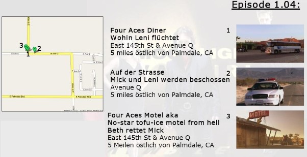 Auf dem Weg von Los Angeles nach Las Vegas machen meine Freundin Melanie und ich einen Abstecher nach Palmdale, dem Drehort der legendären 4. Folge von Moonlight "Fever". Wir versuchen den abgelegenen Ort zu finden. Eigentlich kein Ding, weil die Adresse genau bekannt ist. Problem an der Sache: Irgendwie kommen wir nicht wirklich hinter das System der Straßenbezeichnungen und logisch sieht auch anders aus. Plötzlich wird aus der “Avenue Q” eine Sackgasse, dafür finden sich versetzt die Avenues Q2, Q3, …. usw.