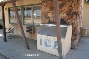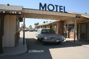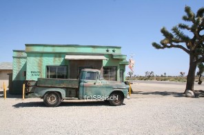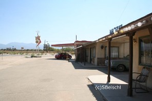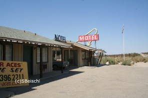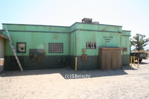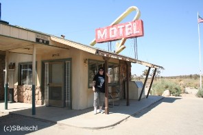 Die Gegend ist auf jeden Fall irgendwie unheimlich, wenn man dort steht und eine zeitlang erst einmal weit und breit keine weiteren Autos bzw. Menschen gesehen werden. Wir sind schließlich schon einige Minuten damit beschäftigt, zig Fotos von der Location zu machen (zumal hier auch das 5. Staffelfinale von NCIS gedreht wurde und Diner, Hotel und Tankstelle befinden sich alle unmittelbar nebeneinander) als sich langsam ein Auto nähert und ein nicht wirklich vertrauensvoll aussehender Typ langsam auf das Gelände fährt und schließlich im hinteren Teil des Geländes verschwindet.