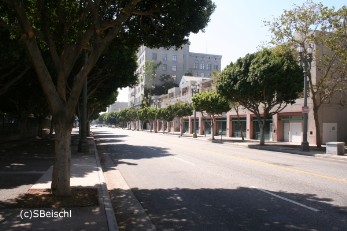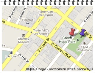 Location Explosion Mustang (rote Markierung)und Tonys Geständnis (blaue Markierung)Downtown Los Angeles:(c) Google Maps