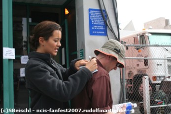 Schließlich kam Sean Murray vom Dach des Parkhauses herunter und fragte scherzhaft Michael nach einem Autogramm :-) . Die beiden waren wirklich gut gelaunt und alberten die ganze Zeit nur herum. Melanie reicht Sean schließlich ein Bild vom Vorjahr, auf dem sie mit Sean abgelichtet ist. Offensichtlich konnte er sich sogar noch daran erinnern, dass Melanie letztes Jahr schon einmal bei einem NCIS-Dreh aufgetaucht war und sich mit Sean und Co. fotografieren lassen hat. Michael quittiert das Foto mit dem Kommentar, dass Sean wohl noch das selbe Hemd von letztem Jahr anhätte (die Hemden sahen sich auch wirklich sehr ähnlich …).