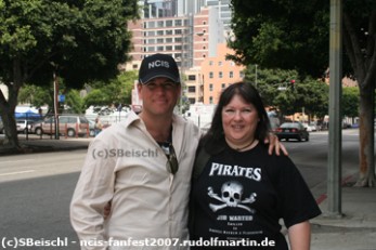 Einige Minuten später kommt Mark Harmon tatsächlich, gefolgt von dem Rest der hungrigen Meute. Angesichts der Menschenmenge sieht Gill (LAPD) die Gefahr, dass Mark uns vor lauter Leuten nicht sieht und macht sich gleich auf, um Mark persönlich noch einmal auf uns hinzuweisen und ihn zu uns zu bringen. Zum Glück kam Mark doch freiwillig mit.