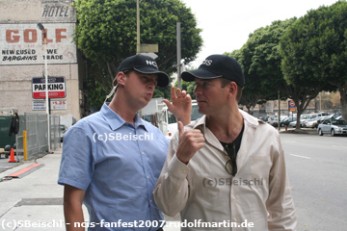 Obwohl wir wissen, dass am Nachmittgag noch unten weitergedreht wird und wir auch die Vermutung hegen, dass eventuell noch “Ducky” und “Palmer” dann dabei sein könnten, entschließen wir uns, den Platz zu verlassen. Wir wollen den Leuten nicht auf den Geist gehen und uns eine Chance, sollte es noch einmal zu so einem Drehorttreffen zu kommen, auf eine erneute Gastfreundlichkeit nicht zu verderben. Wir bedanken uns schließlich bei allen Umstehenden und verabschieden uns. Crew und LAPD wirken geradezu enttäuscht. Extra weist man uns noch darauf hin, dass wir uns doch auch gerne was vom Catering holen dürften (Gil bedauert, dass er nicht weg darf von seinem Platz, sonst hätte er uns doch was geholt…) und auch Toiletten - für den Fall der Fälle - wären nicht weit, dass wir trotz explizitem Hinweis auf die Quelle kostenfreien Essens (aka Bruce Catering) und die im Laufe des Tages irgendwann noetigen Restrooms, nicht den Nachmittagsteil des Shootings verfolgen wollten. Aber man sollte Gastfreundschaft nicht ueberstrapazieren