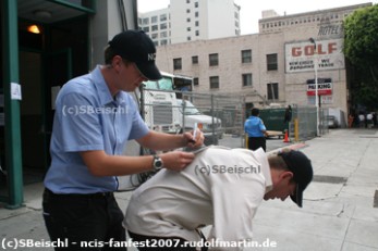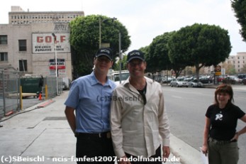 Nun gesellt sich auch Gil von der LAPD zu einem ausführlichen Smalltalk zu uns. Er erklärt uns, was Mark fuer ein netter Kerl sei. Schließlich hält hinter uns noch ein Polizeiwagen an und zwei weitere Police-Officer schauen uns fragend an und fragen uns, auf was wir denn warten würden. Artig berichten wir auch den beiden darüber, dass wir hier beim NCIS-Dreh gerne einmal Mark und Co. treffen würden. Die Beamten grinsen breit, geben uns zu verstehen, dass sie die Serie überhaupt nicht kennen würden, aber wünschen uns noch viel Erfolg, bevor sie sich noch kurz umsehen und wieder mit ihrem Wagen verschwinden.