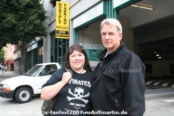 Nach einer Zeit wird unserer Warterei tatsächlich belohnt! Michael Weatherly taucht auf. Er sieht uns nicht sofort und Melanie ruft seinen Namen. Erstaunt dreht er sich um und kommt schließlich zu uns herüber. Wir sind überrascht, wie zugänglich und offen er auf uns reagiert. Offen erzählt er uns, was sie gerade drehen und wer alles da sei und wie der Zeitplan aussieht. Es folgt noch ein wenig privater Smalltalk und er erzählt uns sogar, warum er nicht zum NCIS kommen konnte. Danach gab er Melanie Autogramme und ich schoß meine Fotos.